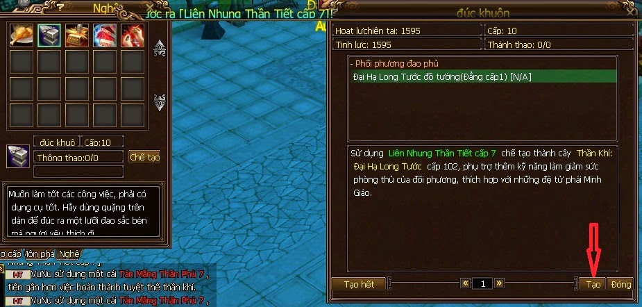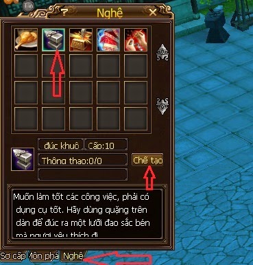 Bước 4: Chế thần Khí => nhấn phím tắt Alt + S hiển thị bảng bạn chọn Nghệ như hình => click nút Chế tạo
