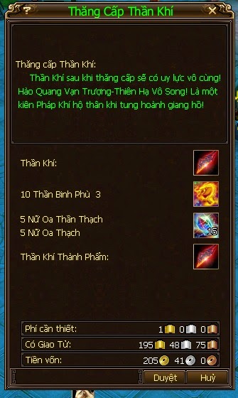 Đặt thần khí vừa chế + 10 Thần Binh Phù 3 + 5 Nữ Oa Thần Thạch => click Luyện Hồn
